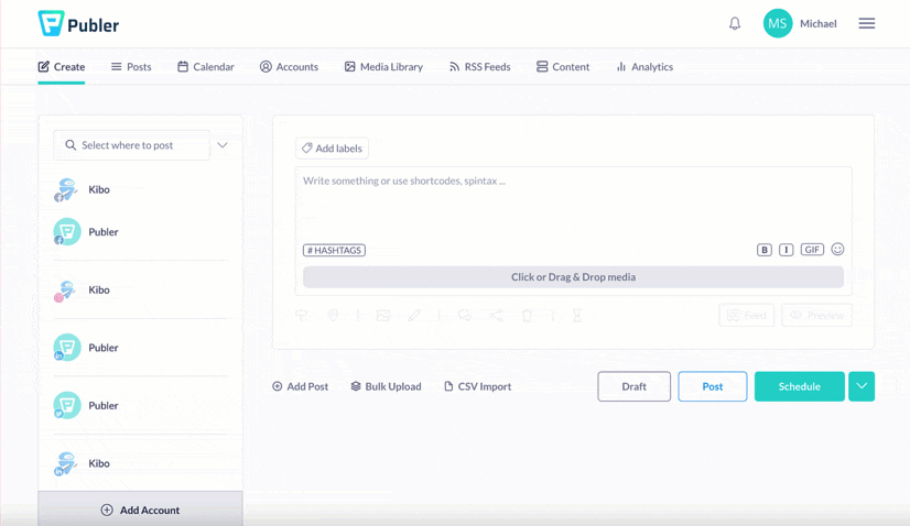 Scheduling your posts for Facebook, Instagram, TikTok, Twitter, LinkedIn, Pinterest, Google Business Profiles, YouTube, WordPress, and Telegram only takes a few seconds:
